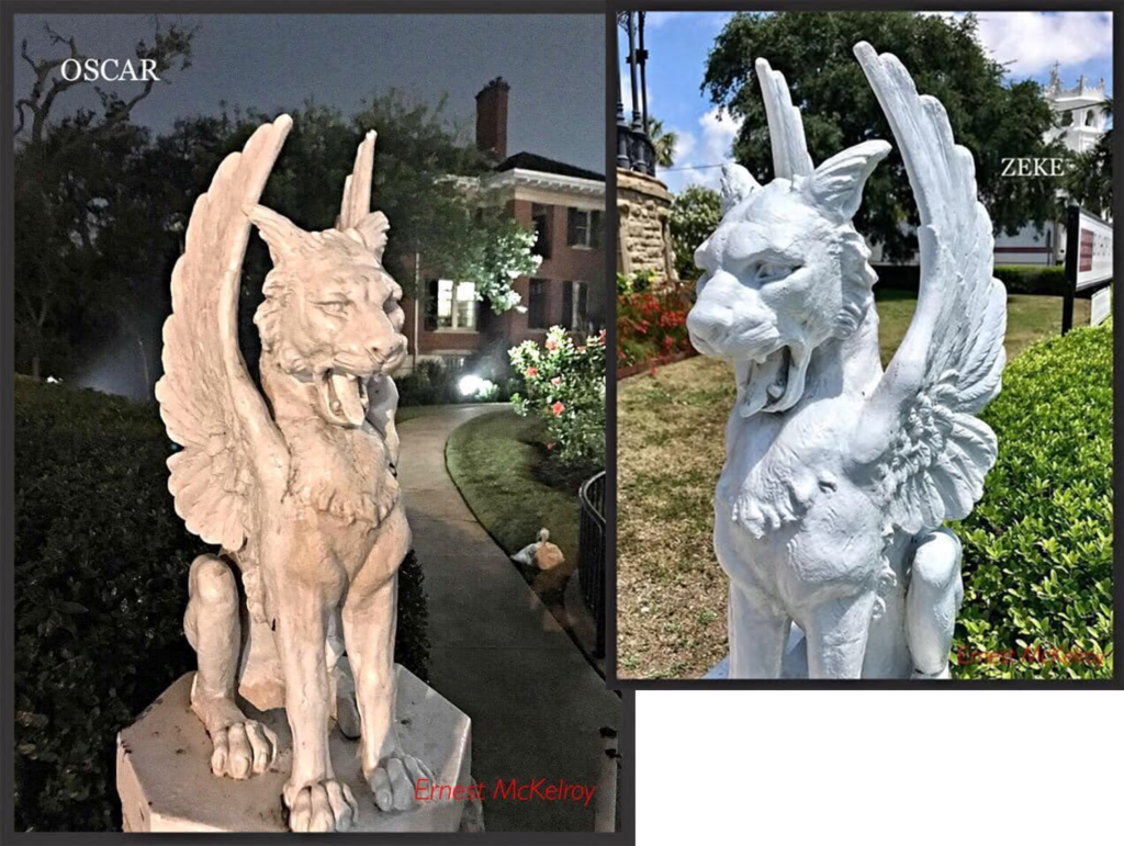 I always thought the winged lions at the gate to the house were added when Bishop Byrnie moved in. Not so. They were installed as part of the original construction and were named Oscar and Zeke. Apparently the Galveston Historical Foundation have Josephine Gresham’s diaries and so they know for sure what the names were, although the docent said they didn’t know who was who. According to a Facebook post by Ernest McKelroy, the left one when facing the castle is Oscar and the right one is Zeke.
