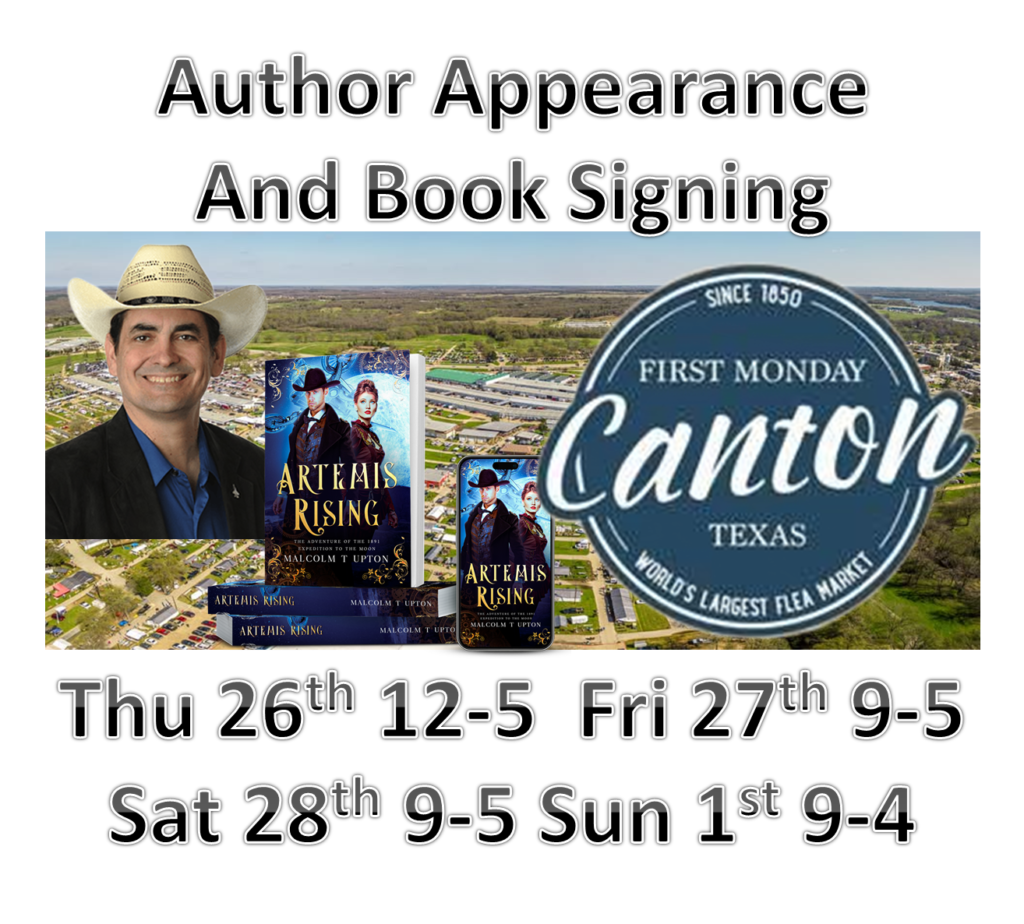 You can get autographed copies of Artemis Rising, Celestial Accord, or Mirim’s First Christmas at Canton First Monday Trade Days Thursday, Friday, Saturday, or Sunday.